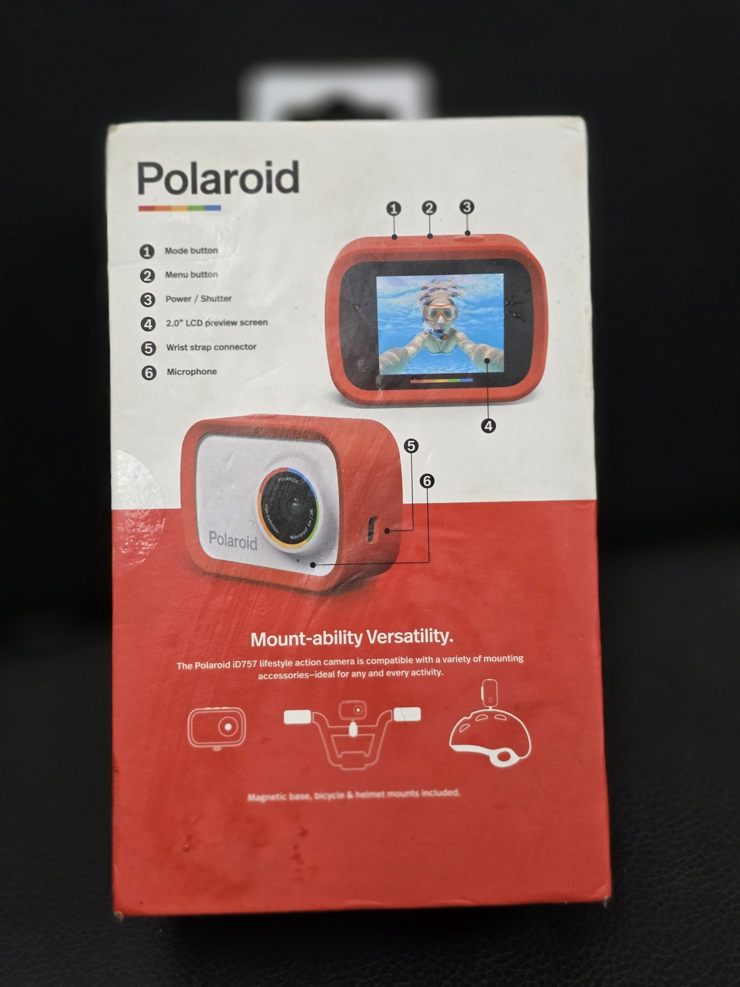 The Polaroid iD757 Waterproof Sport Action Camera is designed for capturing high-definition video and photos during active outdoor adventures, particularly in wet or rugged environments. It is primarily used for sports, vlogging, and travel by those who need a compact, durable camera that can withstand the elements.